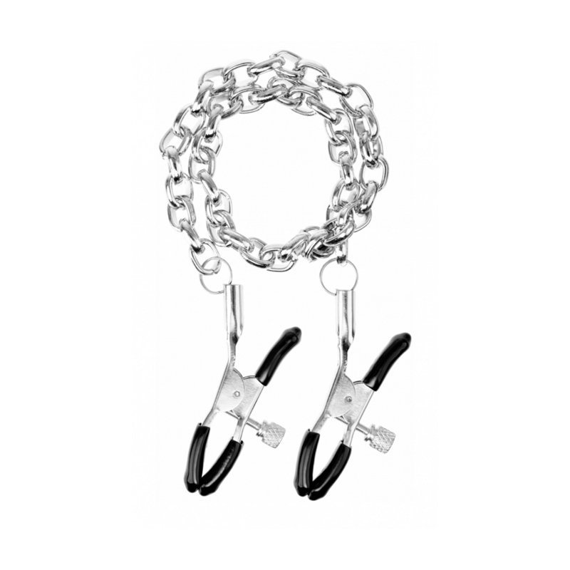 Štipaljke za bradavice sa sjajnim metalnim lančićem, podesivom jačinom pritiska i gumiranim završecima pružaju intenzivnu stimulaciju i udobnost, idealne za BDSM igre.