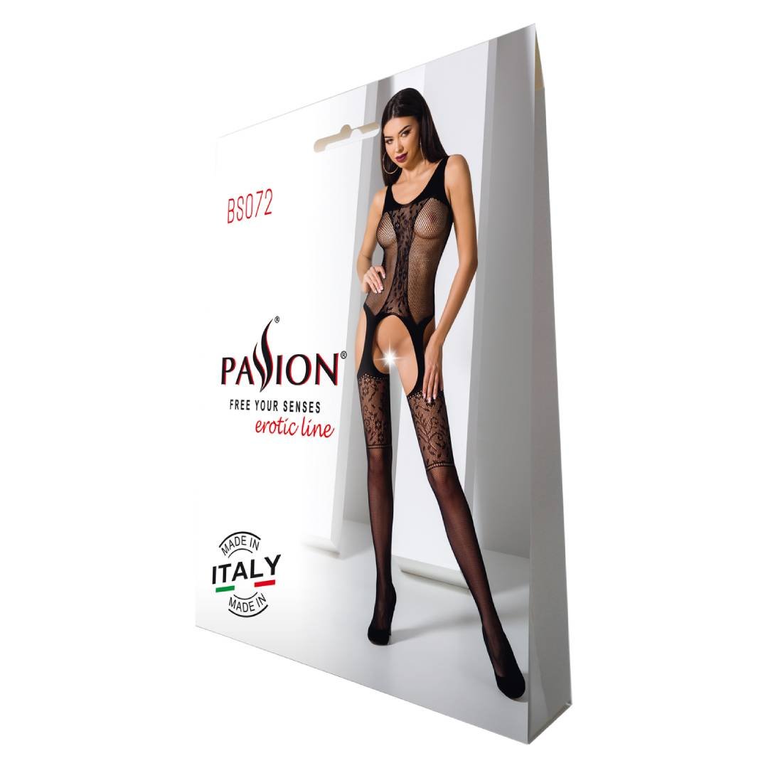 Mrežasti kombinezon – Passion 072 je elastični bodystocking sa čipkastim detaljima, otvorenim dizajnom i efektom halter čarapa. Naglašava obline i pruža zavodljiv, sofisticiran izgled.