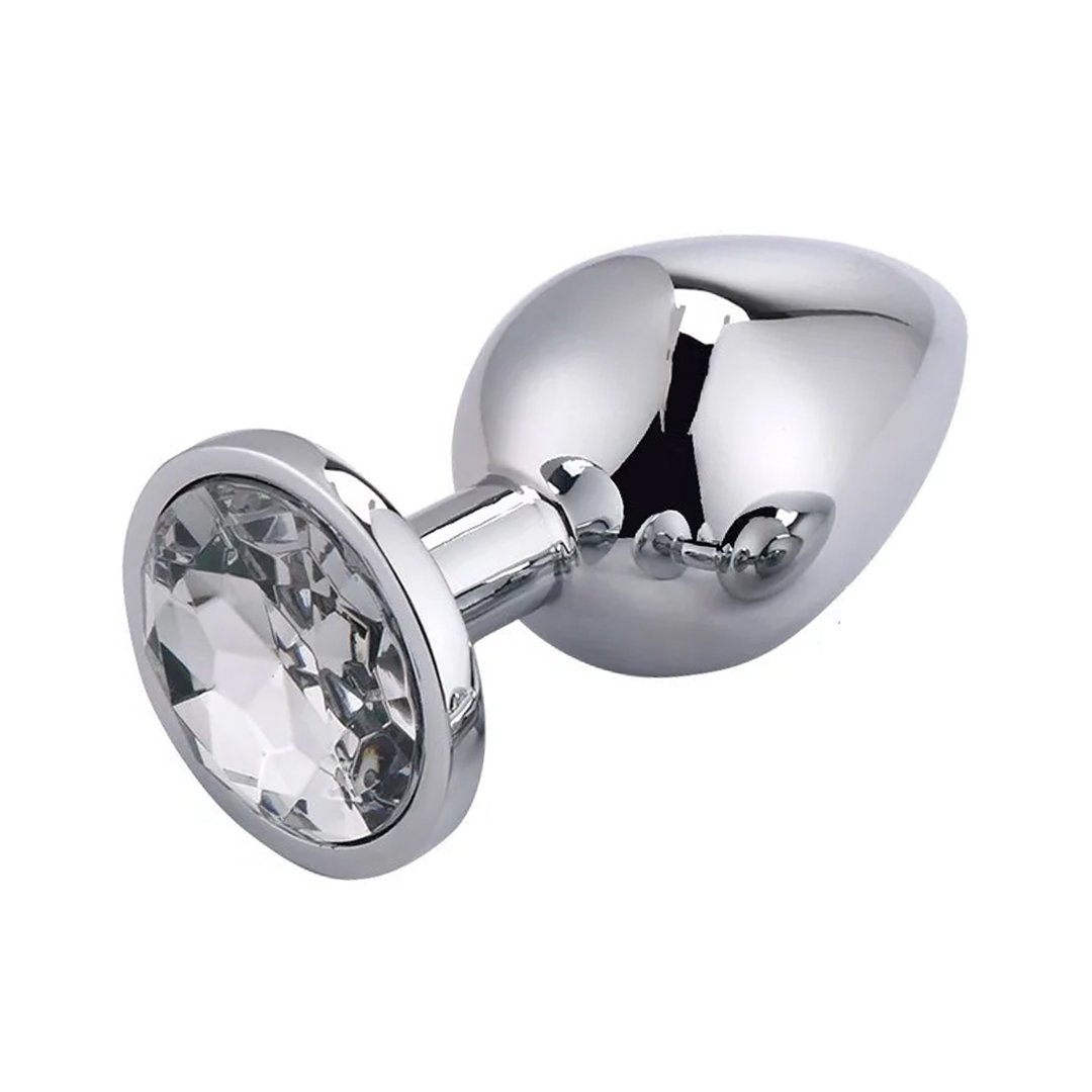Analni plug sa cirkonom L je metalna analna igračka sa sjajnim kružnim belim cirkonom, idealna za elegantnu stimulaciju i vizuelno uzbudljivo analno zadovoljstvo.
