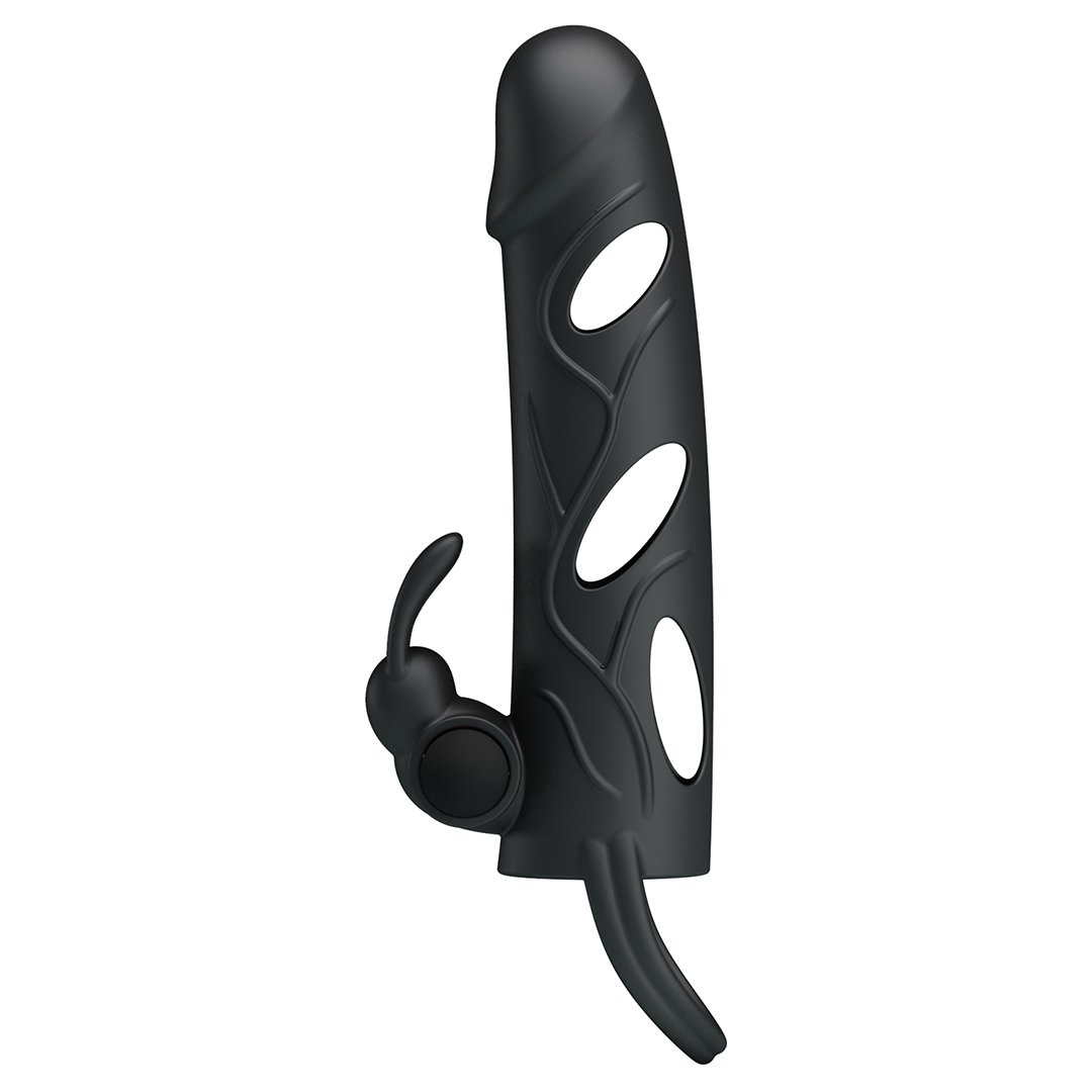 Navlaka sa stimulatorom klitorisa – Crna produžava odnos, održava čvrstu erekciju i istovremeno stimuliše klitoris zahvaljujući vibrirajućem zeki na vrhu. Prsten za testise sprečava spadanje i odlaže ejakulaciju, dok prorezi na navlaci pojačavaju osećaj. Dužina je oko 14 cm.