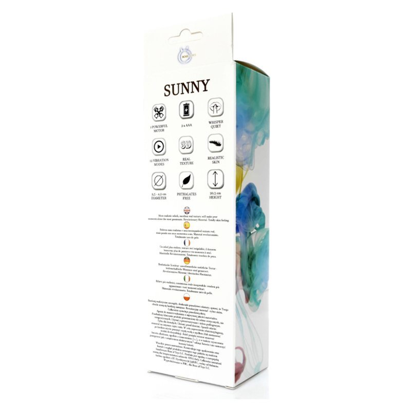 Multifunkcionalni vibrator – Sunny je idealnih proporcija, realisticnog izgleda sa izraženim venama i savršeno imitira pravi penis. Poseduje 12 različitih modova vibracija.Vibrator ima dužinu od 20,5 cm i prečnik od 4,2 cm .
