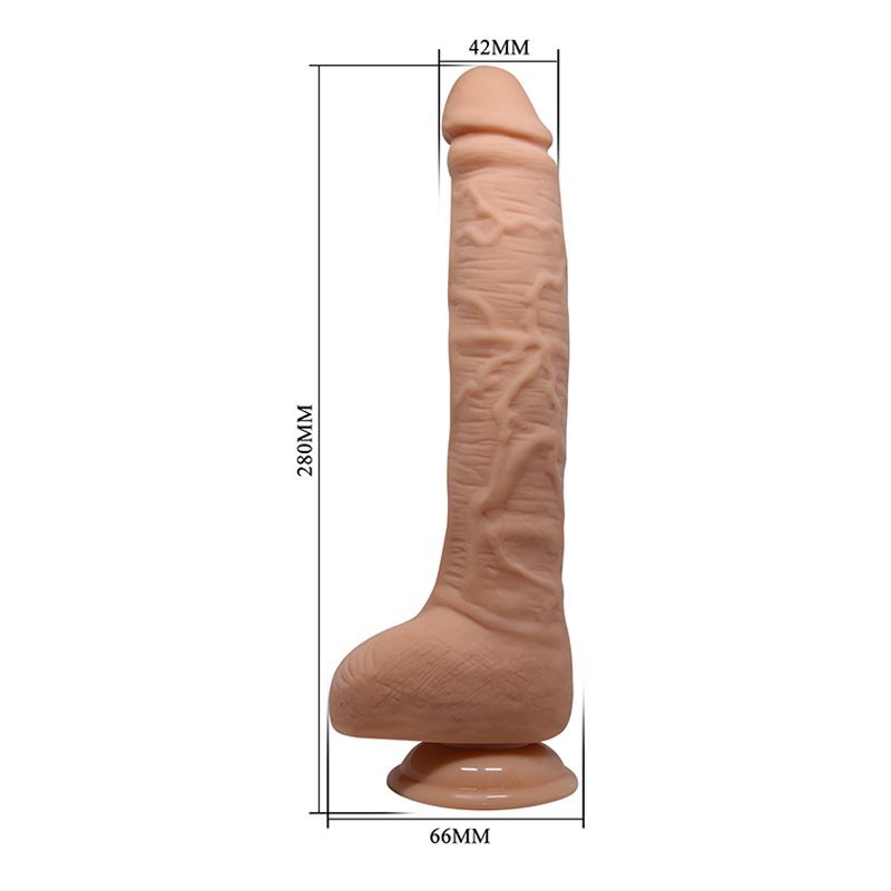Površina vibratora je detaljno izrađena – sa jasno izraženim venama i realističnim testisima, što dodatno pojačava fizičku i vizuelnu stimulaciju. Sa ukupnom dužinom od 27 cm i penetracionim delom od 18 cm, ovaj model pruža moćno i ispunjavajuće iskustvo. Prečnik od 4,1 cm savršeno kombinuje širinu i udobnost, bilo da ga koristite za vaginalnu ili analnu penetraciju.