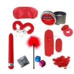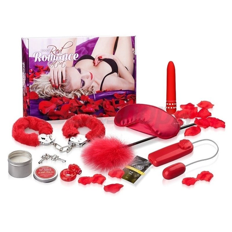 Romance – poklon set od 9 delova uključuje: lisice,vibrator, vibro jaje, golicaljku, masku za oči, vibro prsten, sveću za masažu, lubrikant i latice ruže.